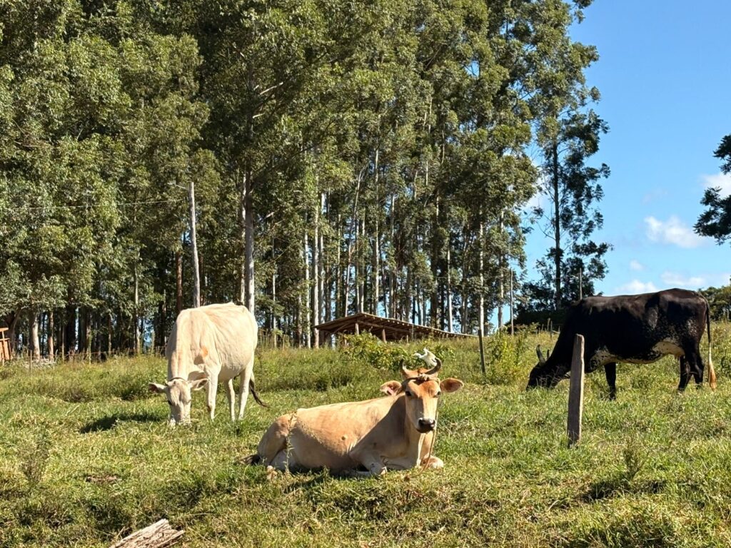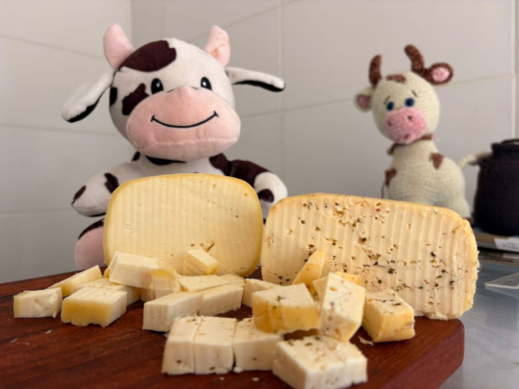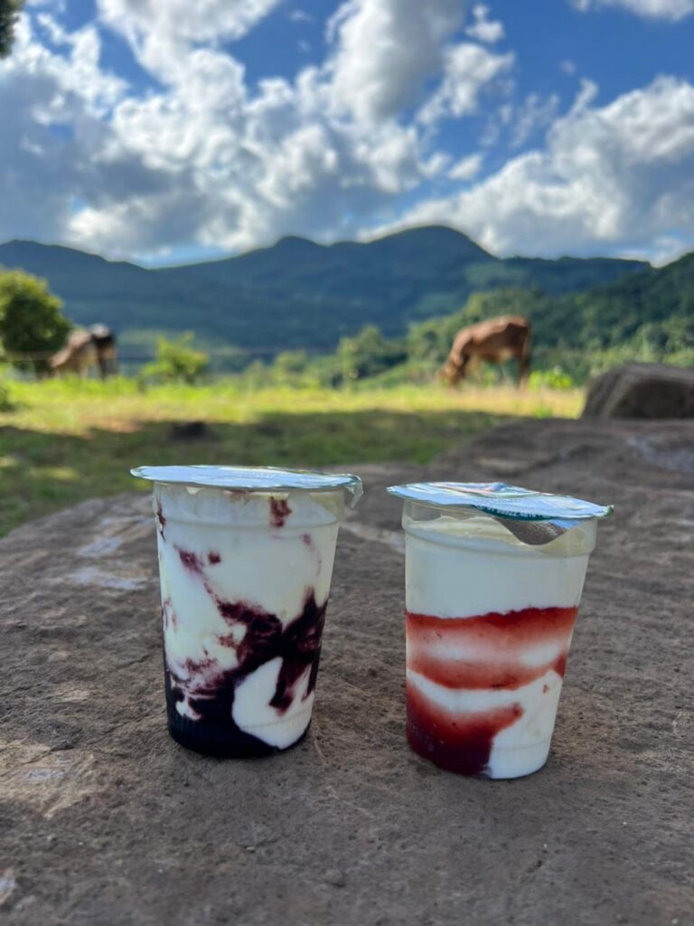 A produção acontece diariamente e inclui queijos, iogurtes e doce de leite, todos feitos com o leite da propriedade. Para quem visita, a experiência vai além de comprar um produto. O cliente pode andar pela propriedade, conhecer o dia a dia da agroindústria e ainda alimentar os animais que vivem soltos pelo local, o que torna o passeio especialmente interessante para famílias com crianças e para quem gosta de estar perto da natureza e dos animais.
